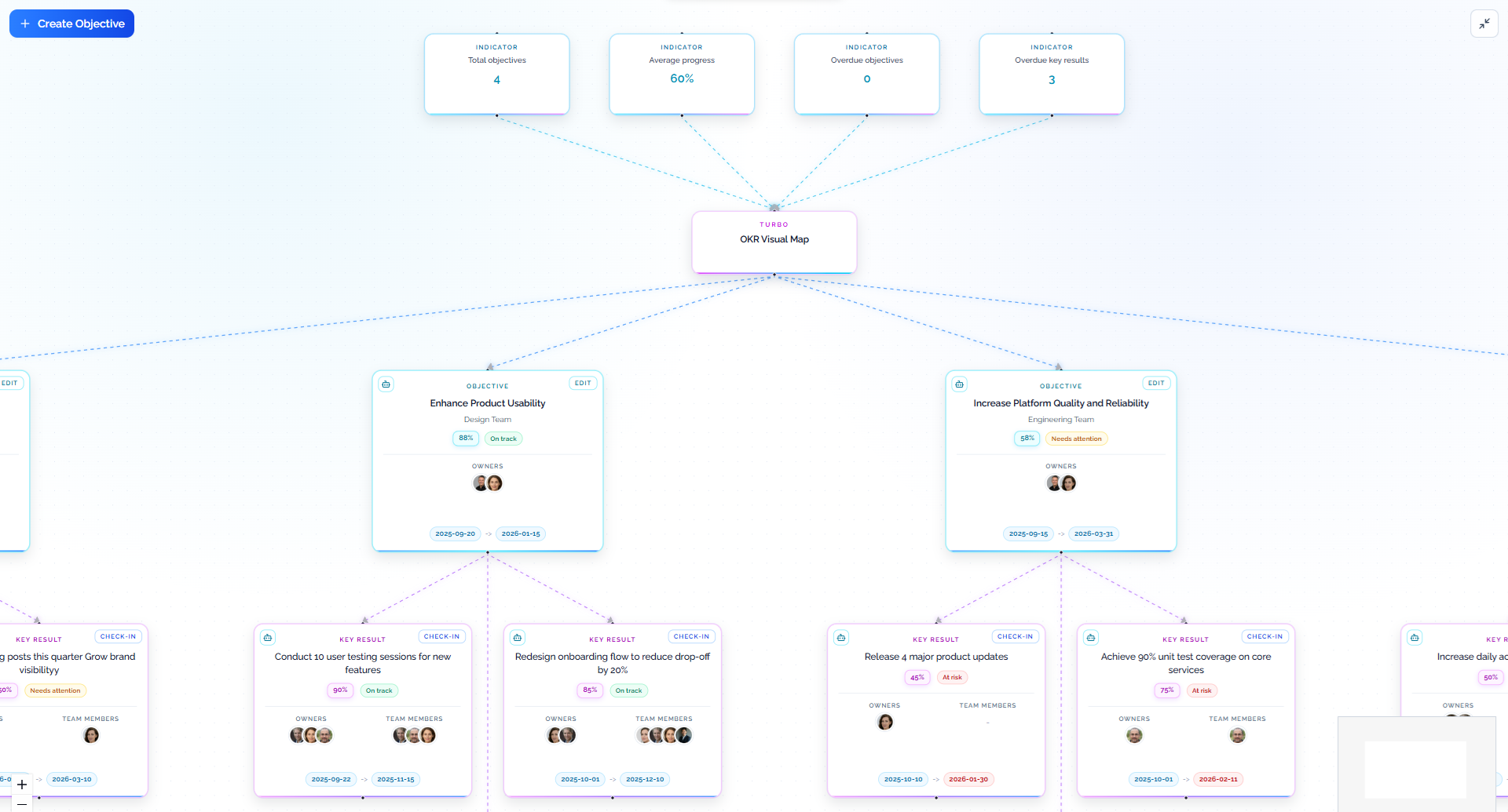 Visualize Objectives and Key Results in a connected tree layout. Expand branches, inspect parent-child relationships, and spot structure gaps faster during planning and reviews.